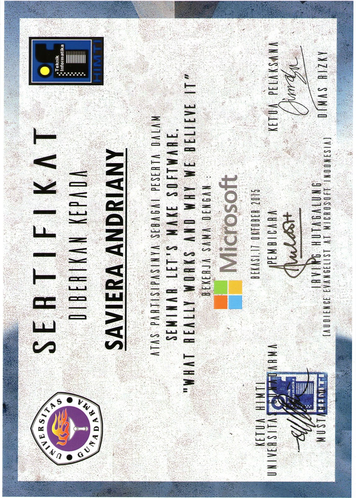 Seminar ini diadakan oleh Himpunan Mahasiswa Teknik Informatika, diadakan pada tanggal 17 Oktober 2015 di Universitas Gunadarma Kampus J1. Bekerja sama dengan Microsoft dan mendatangkan Bapak Irving Hutagalung sebagai pembicara.